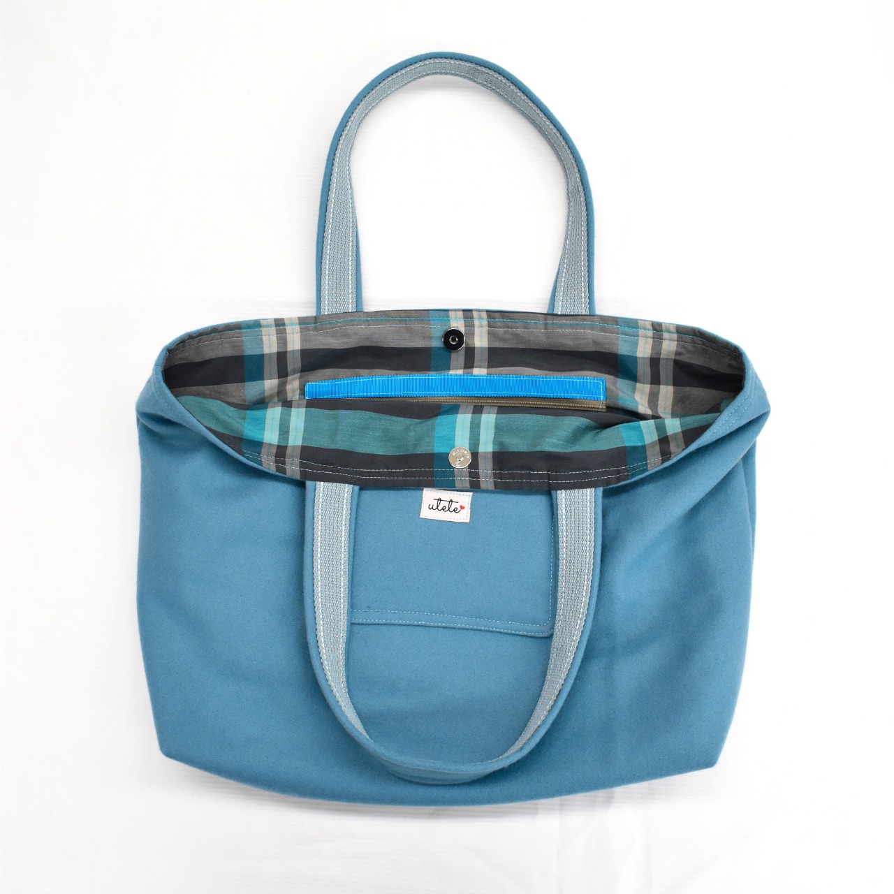 冬の街にそっと映える、やわらかな青色ウールのトートバッグができました。
